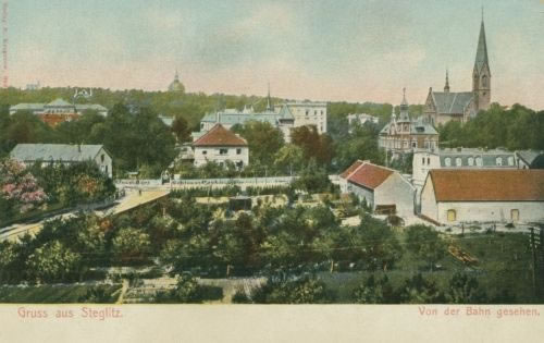 Blick über den Bahndamm zur Schloßstraße und zum Fichtenberg mit Wasserturm (1886 in Betrieb genommen)
