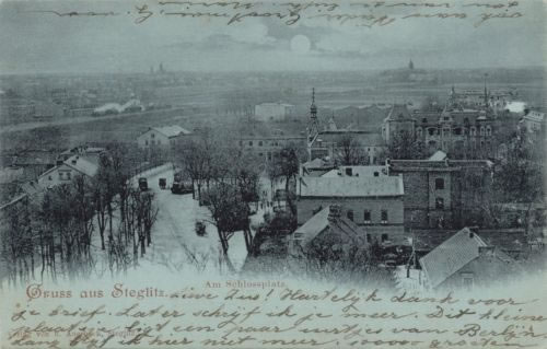 Blick über die Schloßstraße (links mit Knick verlaufend) nach Lichterfelde und rechts über die Dächer der alten Dorfschule, der Feuerwache und der Villa Pasemann; dazwischen das Wrangelschlößchen mit "Schloßplatz"; frühe Aufnahme vor 1900